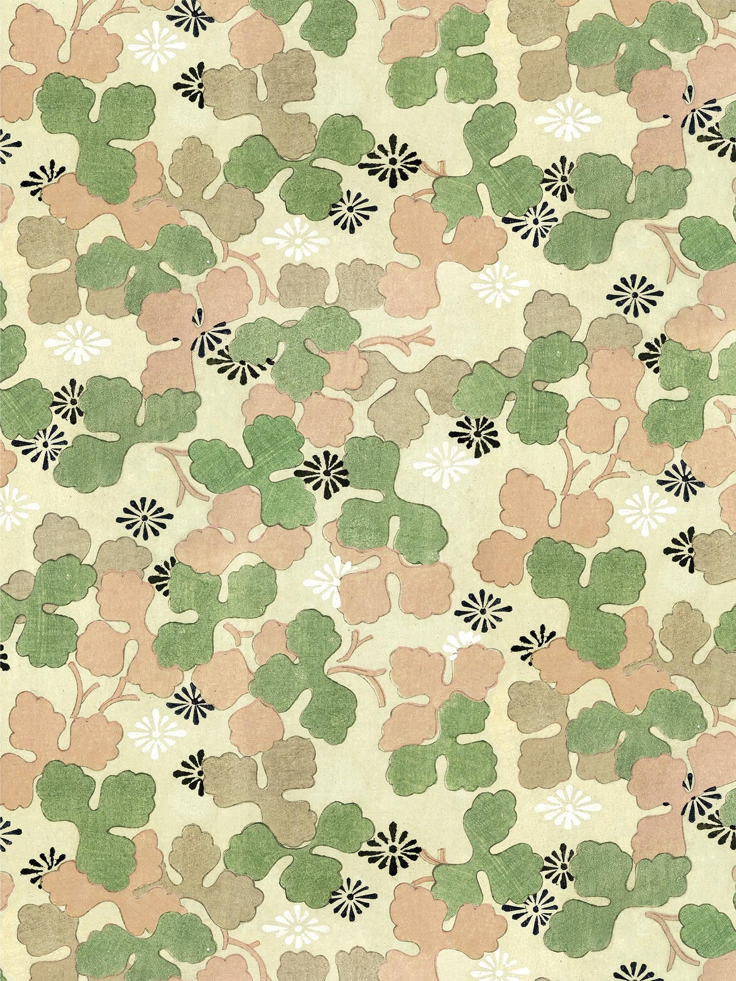 Originally a Shin-Bijutsukai woodblock print on paper, this canopy of creeping wood sorrel symbolises resilience, persistence, and prosperity. A classic Meiji-era design element, Katabami is tougher than clover and a true survivor among plants. Growing in overlooked places like stone paths and the edges of rice fields, it thrives in adversity, its modesty masking its quiet strength.